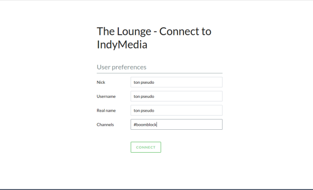 Tu écrit ce que tu veux dans "Nick", "username", "realname" : c’est ton pseudo ! Et dans "channel" tu mets "#boomblock" et tu clique sur "connect".