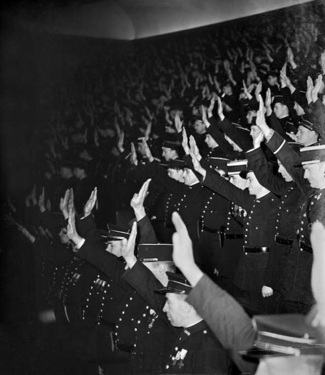 Prestation de serment des agents de police, faisant le salut fasciste au palais de Chaillot, à Paris, en janvier 1942 (photographie interdite par la censure). © LAPI / Roger-Viollet