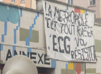 Partie 6. « Ils veulent expulser l’ECG ? Lol » proclame une affiche collée un peu partout à la Guillotière et affichée à l’entrée du bâtiment. Discussion avec des membres du collectif ECG autour de la menace d’expulsion et des enjeux de la semaine du feu et micro-trottoir dans l’Annexe sur l’ambiance de la semaine.