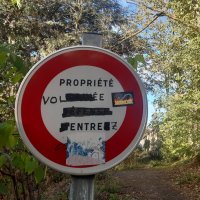 Image : Panneau de propriété privée détourné dans le Bois de la Caille près de Lyon : "Propriété volée, entrez".