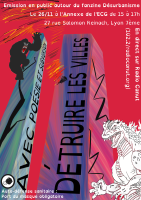 Pendant 2h, on discutera de l’ouvrage, du fanzine et de sa réalisation avec son autrice, de la ville comme espace dominé et structuré par le capitalisme, des luttes et des critiques qui émergent pour la détruire ou la détourner. Ce sera aussi l’occasion de donner de la voix pour adapter des morceaux de l’ouvrage à l’antenne et faire entendre certaines de ses pages. L’émission se terminera par un temps d’échange avec le public.