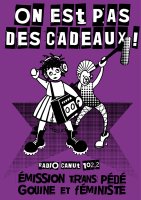 Le 25 Décembre 2020, « On est pas des cadeaux ! » organise sa soirée de départ. Quoi de plus somptueux que de tirer sa révérence un 25 Décembre pour des dépravéEs de Noël, pour touTEs les TPG non-invitéEs à cette fête des familles. « On est pas des cadeaux ! » se barre le jour de la naissance du pti’ jésus, de jingle bells et du foie gras. Notre au revoir, lui, sera bruyant et plutôt dissonant, païen avec amour, sans bûche mais avec des butchs, avec de la bière et des chips, plein de grosses boules mais pas sur le sapin, de mauvais genre mais avec classe, de mauvais goût mais avec de la salive, par nos chaleurs entremêlées, avec de l’air entre les ondes, des micros pleins de rêves et d’horizons, entre TPG, avec de l’électricité comme paillettes.