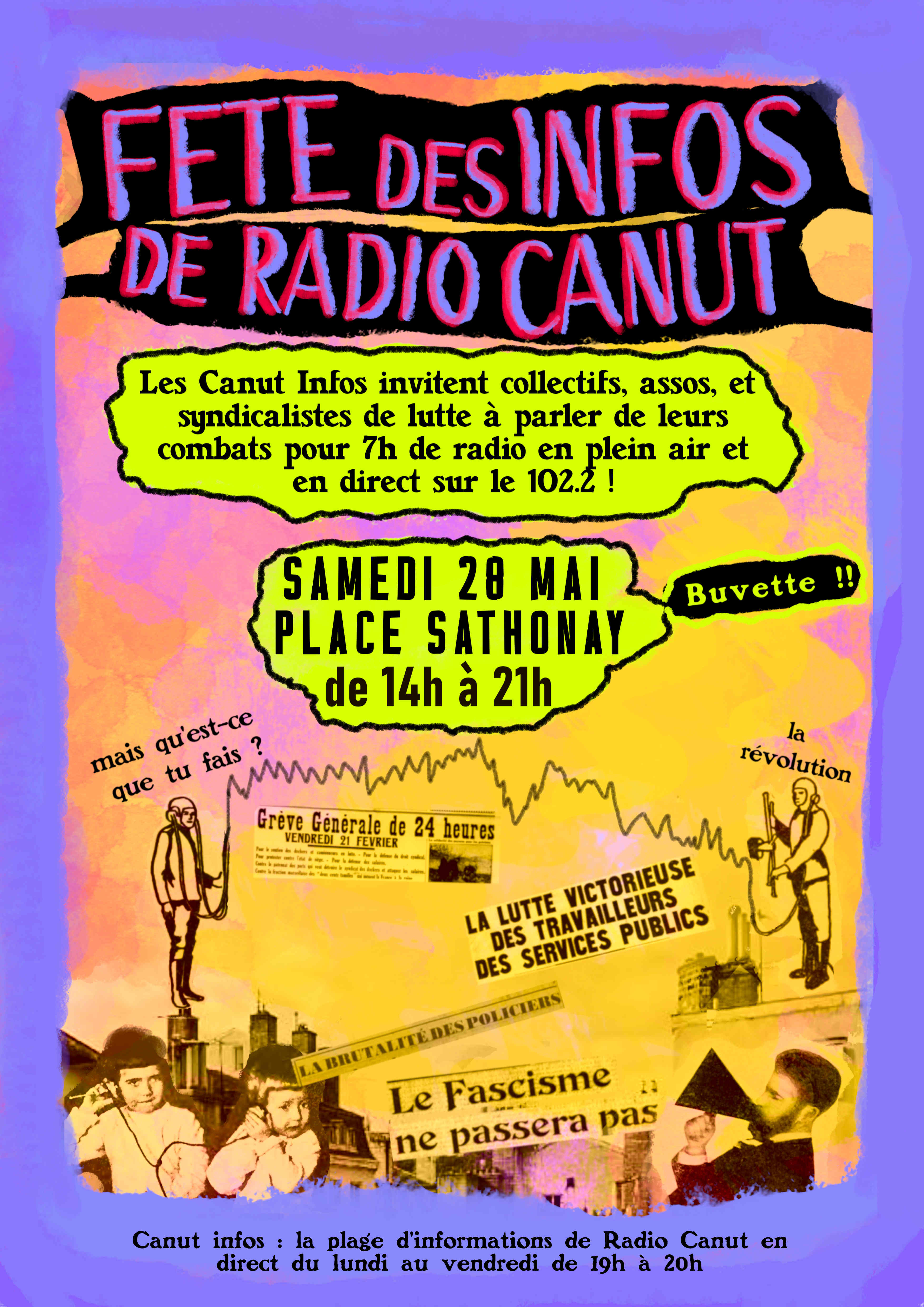 Le 28 mai, c’est la fête des canut infos ! Les émissions quotidiennes d’actualités de Radio Canut prennent la rue. De 14h à 22h, 8 heures non stop de radio en plein air. En public et en direct de la place Sathonay, les canut infos invitent collectifs, assos, et syndicats à venir parler de leurs luttes, de leurs actions, et de leurs modes d’organisation sur le 102.2. FM. Viens assister à ces discussions en direct, réécouter reportages et petits bouts d’émissions, rencontrer tes animateurs et animatrices favorites. Profites-en pour boire un coup et partager un moment de rencontres et d’échanges avec des camarades. Tu te souviens de la militante féministe que t’avais entendu l’année dernière, des cheminot⋅es que t’avais croisé sur un piquet de grève, etc. ? Le 28 mai, c’est l’occas de se rencontrer en partageant une journée radio ensemble. On t’attend avec tes potes pour cette fête des infos de la plus rebelle des radios !