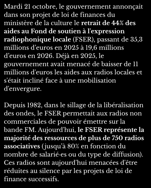 Mardi 21 octobre, le gouvernement annonçait dans son projet de loi de finances du ministère de la culture le retrait de 44% des aides au Fond de soutien à l’expression radiophonique locale (FSER), passant de 35,3 millions d’euros en 2025 à 19,6 millions d’euros en 2026. Déjà en 2025, le gouvernement avait menacé de baisser de 11 millions d’euros les aides aux radios locales et s’était incliné face à une mobilisation d’envergure.