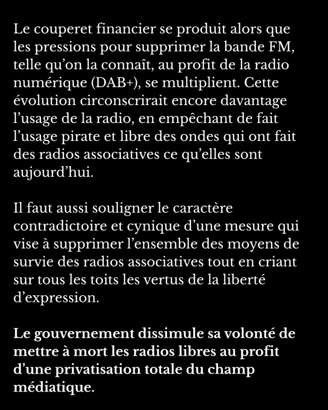 Il faut aussi souligner le caractère contradictoire et cynique d’une mesure qui vise à supprimer l’ensemble des moyens de survie des radios associatives tout en criant sur tous les toits les vertus de la liberté d’expression. Le gouvernement dissimule sa volonté de mettre à mort les radios libres au profit d’une privatisation totale du champ médiatique.