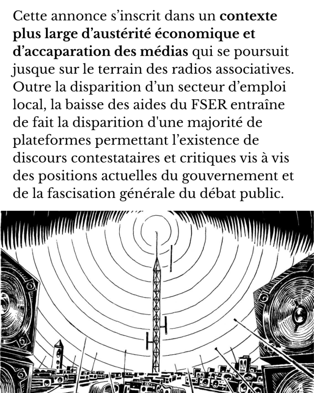 Cette annonce s’inscrit dans un contexte plus large d’austérité économique et d’accaparation des médias qui se poursuit jusque sur le terrain des radios associatives. Outre la disparition d’un secteur d’emploi local, la baisse des aides du FSER entraîne de fait la disparition d’une majorité de plateformes permettant l’existence de discours contestataires et critiques vis à vis des positions actuelles du gouvernement et de la fascisation générale du débat public.