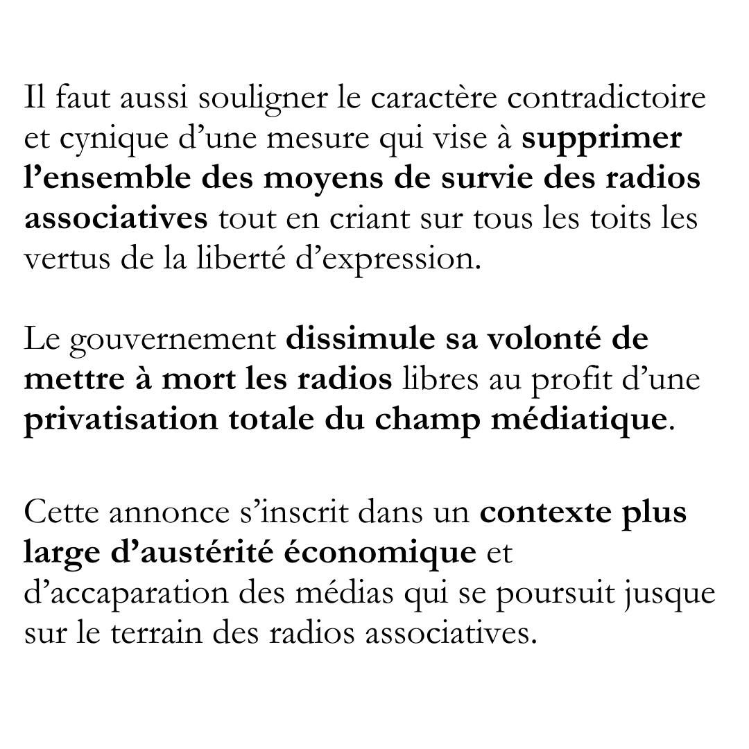 Il faut aussi souligner le caractère contradictoire et cynique d’une mesure qui vise à supprimer l’ensemble des moyens de survie des radios associatives tout en criant sur tous les toits les vertus de la liberté d’expression. Le gouvernement dissimule sa volonté de mettre à mort les radios libres au profit d’une privatisation totale du champ médiatique.