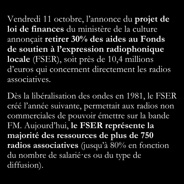 Vendredi 11 octobre, l’annonce du projet de loi de finance du ministère de la culture annonçait retirer 30% des aides au Fonds de soutien à l’expression radiophonique locale (FSER), soit près de 10,4 millions d’euros qui concernent directement les radios associatives.