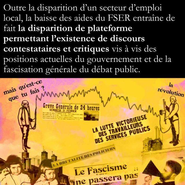 Cette annonce s’inscrit dans un contexte plus large d’austérité économique et d’accaparation des médias qui se poursuit jusque sur le terrain des radios associatives. Outre la disparition d’un secteur d’emploi local, la baisse des aides du FSER entraîne de fait la disparition de plateformes permettant l’existence de discours contestataires et critiques vis à vis des positions actuelles du gouvernement et de la fascisation générale du débat public.