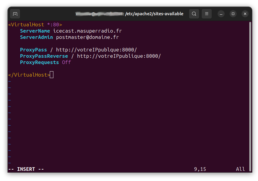L’objectif est de dire à apache de rediriger les demandes faites à l’adresse icecast.ndd.tld vers vers le port 8000 qui est celui du serveur Icecast.