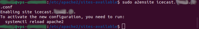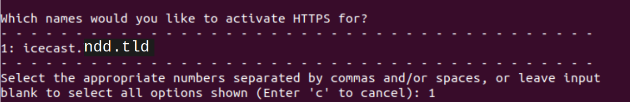 Si suite à d’autres utilisations de apache vous aviez plusieurs choix, il suffit de trouver le choix qui correspond à ‘icecast.ndd.tld’ et de rentrer le numéro correspondant au lieu de 1