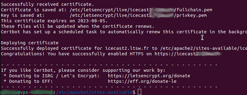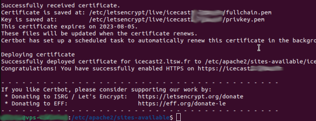 Là il faut attendre quelques secondes en regardant ‘Requesting a certificate for icecast.ndd.tld et….