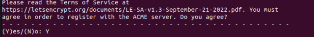 Le terminal demande si on a lu les conditions d’utilisation (qui sont ici : https://letsencrypt.org/documents/LE-SA-v1.3-September-21-2022.pdf, validez avec :