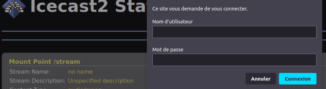 En cliquant sur ‘Administration’ une petit fenêtre appaira en vous demandant votre login et mot de passe d’administration. (admin + le mot de passe super solide si vous avez suivi ce guide). En cas d’oublie vous pourrez les retrouver dans le fichier de configuration de Icecast (voir section précédente)
