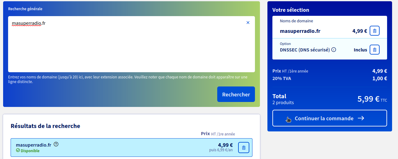 Puis dans barre de recherche tapez le nom de domaine que vous voulez pour votre radio et cliquez sur acheter