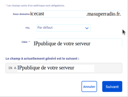 Nous allons créer un sous domaine pour que l’accès à icecast se fasse via une adresse de type icecast.ndd.tld . En effet, vous voudrez sûrement que votre nom de domaine ndd.tld pointe vers un site, et sur une page de statistique de icecast.