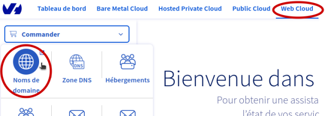 Une fois sur la page de votre compte, cliquez sur ‘Web Cloud’ en haut, puis gauche sur ‘Commander’ et enfin dans le menu choisissez ‘Noms de domaine’